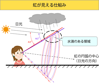 雨上がりの空には無数の水滴が浮かんでいます。これらの水滴群に太陽の光(白色光)が入射すると、水滴の表面で屈折現象が起こります。屈折した光は波長によって異なる方向に進行し水滴の内面の別の場所で空気との界面に達し、そこで殆どの成分は鏡面反射されます。(一部は界面を通過して空気中へ抜けます。)界面で反射した光は進行方向を変えて再び空気との界面に達し、空気中へ屈折して抜け出して行きます。つまり、水滴へ入射した太陽光は屈折・反射・屈折という過程を経て空気中へ再放出される訳です。その結果、図のように、例えば可視域短波長成分(紫色に見える)は太陽からの入射光方向に対して約40°の角度で折り返すことになり、可視域長波長成分(赤く見える)は入射光方向に対して約42°の角度で折り返すことになります。このような現象が、空中に浮遊している水滴の全てで同時に生じている訳です。