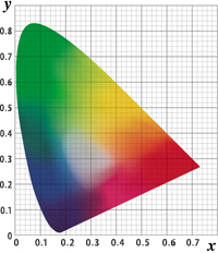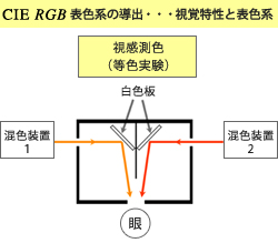 本連載の第 16 回、17 回でお話しましたように、加法混色(同時加法混色)では、三原色の赤、緑、青の色光を混ぜ合わすことによって、様々な色を作り出すことができます。つまり、この時の三原色の混色比を指定すれば混色結果の色が一義的に決まることになりますので、これに基いて表色系の構成が可能になる訳です。