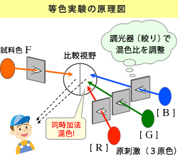 従って、調光器(絞りなど)で三原色の混色比 r : g : b を色々変えながら調整し、左右の視野が 「等色」 した時には