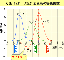その結果得られた波長毎の混色比特性が RGB 表色系の等色関数と言われるものです(右図)≪※2≫ 。