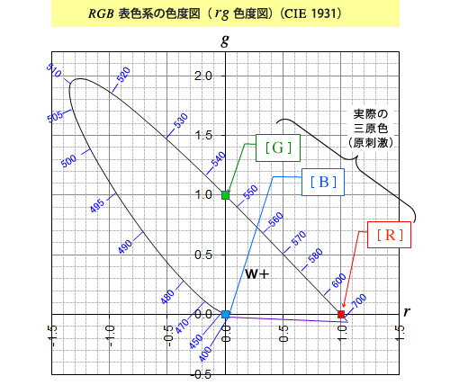 r g 色度図を見ると、第2象限( r < 0 、g > 0 ) の領域に色度域が大きく張り出しているのが目立ちます。この領域は