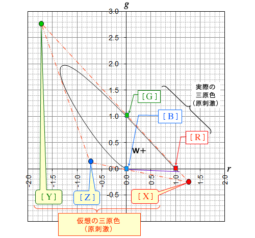 原刺激 [ X ]、[ Y ]、[ Z ] は、上図のような r g 色度図の表色領域に外接する三角形を想定し、その頂点で示される仮想の色(虚色)となります。こうすれば、表色領域の中の全ての座標点は、