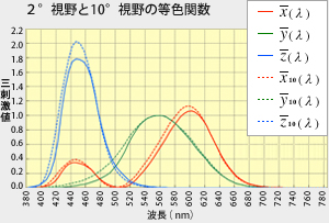 ≪※2≫ 等色関数と観察視野角度( 2° 視野 と 10° 視野) ・・・・・ 色の面積効果