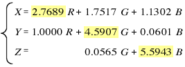 上述のように座標変換した結果、RGB 表色系の三刺激値 R、G、B と XYZ 表色系の三刺激値 X、Y、Z の間には以下の式で表される関係があります。