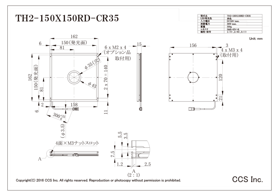 幅162mm x 奥行き162mm x 高さ15mm、発光面150mm x 150mmの赤色照明。穴あきタイプ。